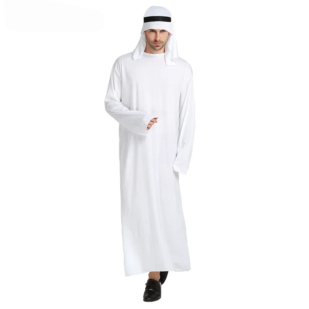 2025 New Adult Men Arabian Arab Sheikh Costume Middle East Clothes Sultan White Robe Red Headband Purim Halloween Fancy Dress