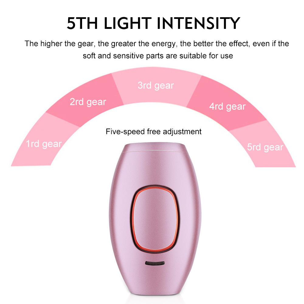 IPL hair removal device with 5 adjustable levels energy evenly distributed to accommodate different skin and hair removal areas.